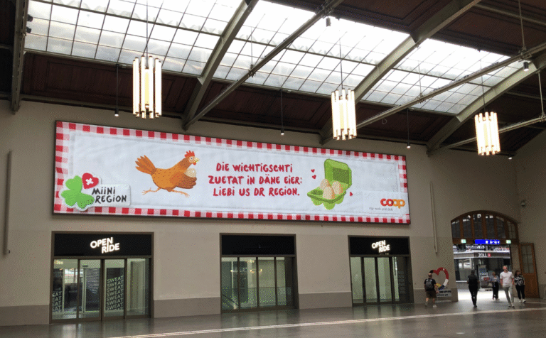 2024 und 2025 warb Coop mit diversen Sujets, die an gestickte Küchentücher erinnern, für die Marke «Miini Region». Ein Plakat ist mit der Aufschrift: «Die wichtigschti Zuetat in däne Eier: Liebi us dr Region» versehen. Gezeigt wird ein Huhn, das scheinbar freudig und freiwillig ein Ei zu einem mit Herzchen umrahmten Eierkarton bringt. Das Sujet setzt dabei auf eine emotionale Botschaft: Die Küchentuch-Ästhetik ruft Bilder einer bäuerlichen Idylle hervor, suggeriert wird eine liebevolle Produktion auf dem Hof in der Nachbarschaft.