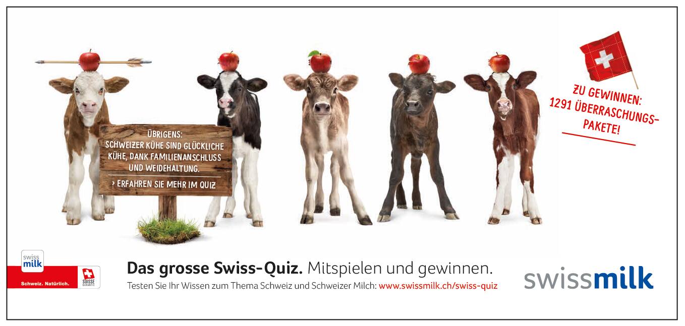 2017 warb Swissmilk auf diesem Plakat damit, dass Schweizer Kühe «glücklich» seien, dank «Familienanschluss und Weidehaltung». Diese Werbeaussage entspricht jedoch nicht der Realität: Die allermeisten Milchkühe haben keinen Anschluss an ihre eigene Familie. Kälber werden kurz nach der Geburt von ihren Müttern getrennt – eine gängige Praxis in der Milchproduktion.